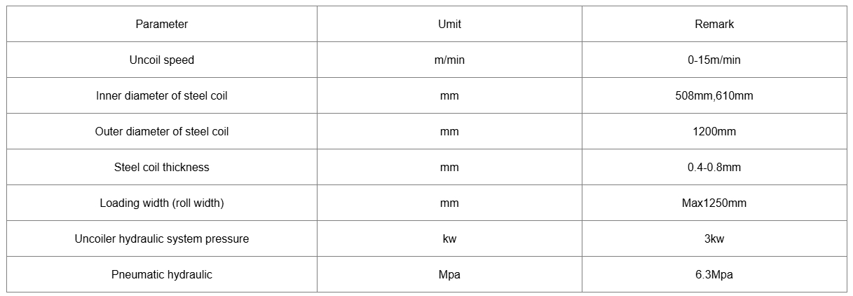 The main specifications of hydraulic uncoiler are 5 tons, 7 tons, 10 tons, 12.5 tons, 15 tons and 20 tons. Mainly used for coil feeding and recycling. Each set of uncoiler includes feeding trolley, V-shaped loading interface, hydraulic station, auxiliary