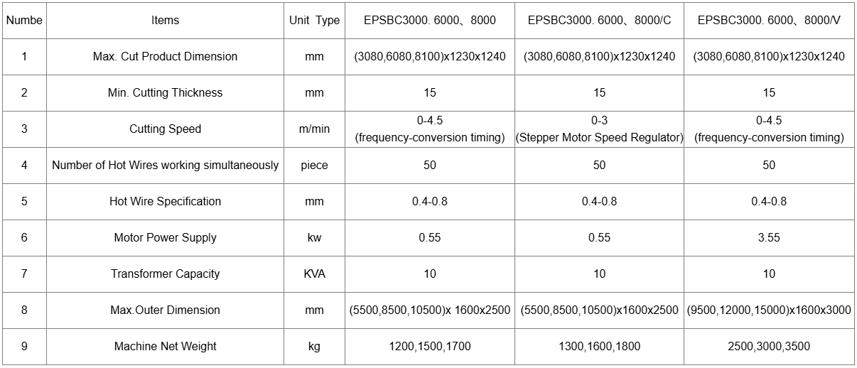 2. The EPSBC6000 has the Horizontal, Vertical and Edge surface cutting wires to achieve the three-dimensional (3D) cutting of the EPS Blocks, the Edge surface cutting wire is equipped with its own Cutting Machine, and can operate together with the horizontal and vertical cutting wires at the same time. This machine uses the Clutch to achieve a quick return of the cutting frame.